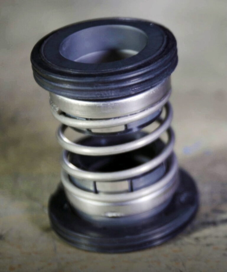 Der Eintritt über die Dichtung an der Pumpenöffnung im Gehäuseboden ist schon heikler. Hier gilt die innen liegende doppelte Gleitringdichtung als Goldstandard. Sie wirkt zweiseitig, wobei der Druck durch eine starke Spiralfeder erzeugt wird. Der untere Teil ist die eigentliche Dichtung (nach außen), der obere Teil schützt den Motorraum.