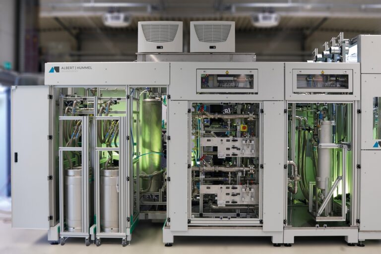Bei der sogenannten PEM-Elektrolyse dient eine Protonen-Austausch-Membran (Proton Exchange Membrane) als ionisch leitfähiges Medium zwischen Anode und Kathode. Wenn eine Spannung anliegt, wird Wasser an der Anode aufgespalten. Es entsteht Sauerstoff, die Protonen wandern durch die Membran zur Kathode und reagieren dort zu Wasserstoff. Vor der Inbetriebnahme müssen die Elektrolyseure in den Prüfstand und konditioniert werden. Sie werden befeuchtet, denn die Membranen müssen für den Betrieb einen bestimmten Feuchtegrad haben. Für einen ihrer Kunden hat die Albert & Hummel GmbH deshalb jetzt einen vollautomatischen Prüfstand für Elektrolyseure beziehungsweise deren Stacks entwickelt.